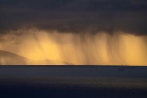 Rainstorm over the pacific with sunset light behind it. Near Catalina Island